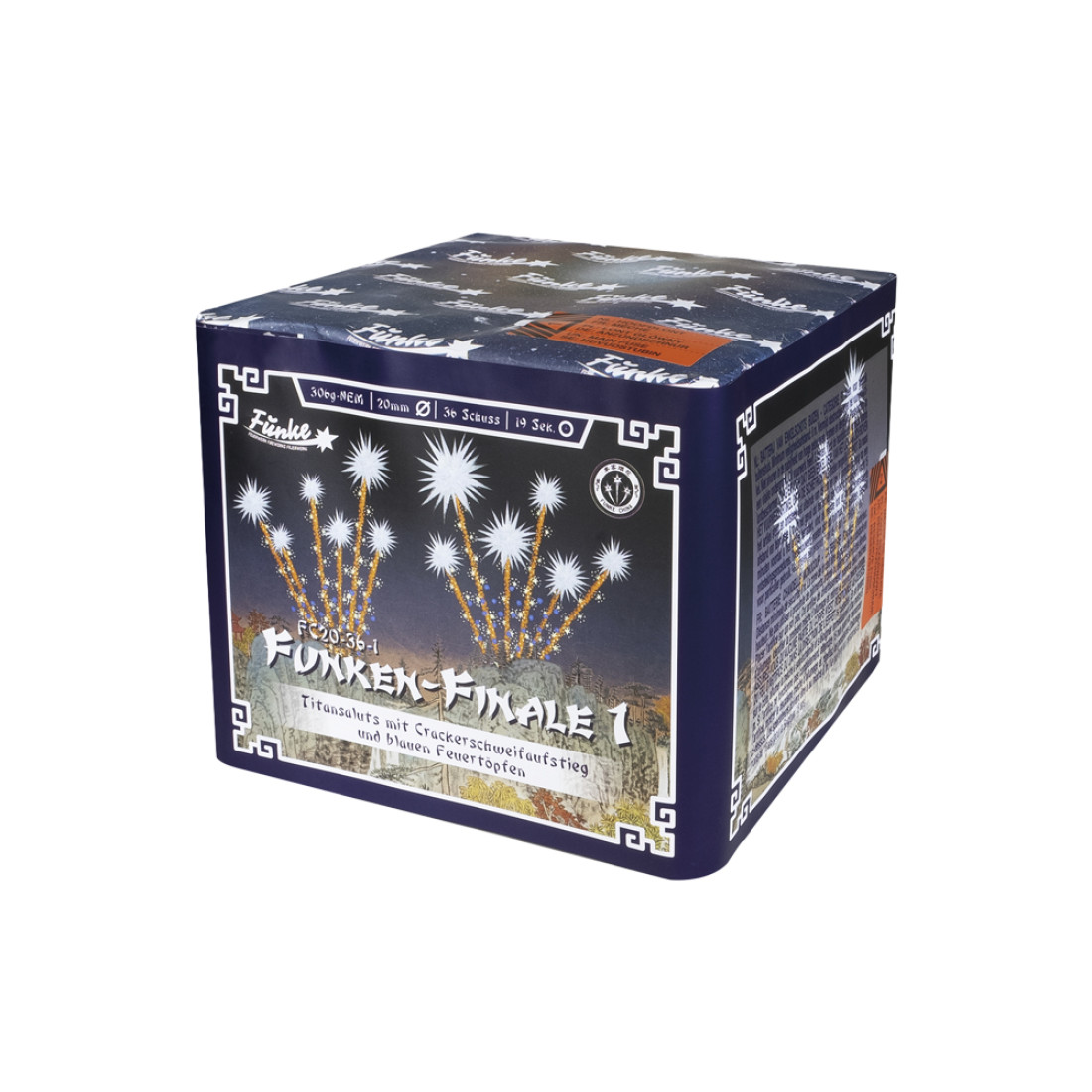 Kaliber 20mm aus blauen Feuertöpfen zu Cracker-Schweif mit abschließendem Titansalut. Geschossen in rasanter, sich steigernder Schussfolge.